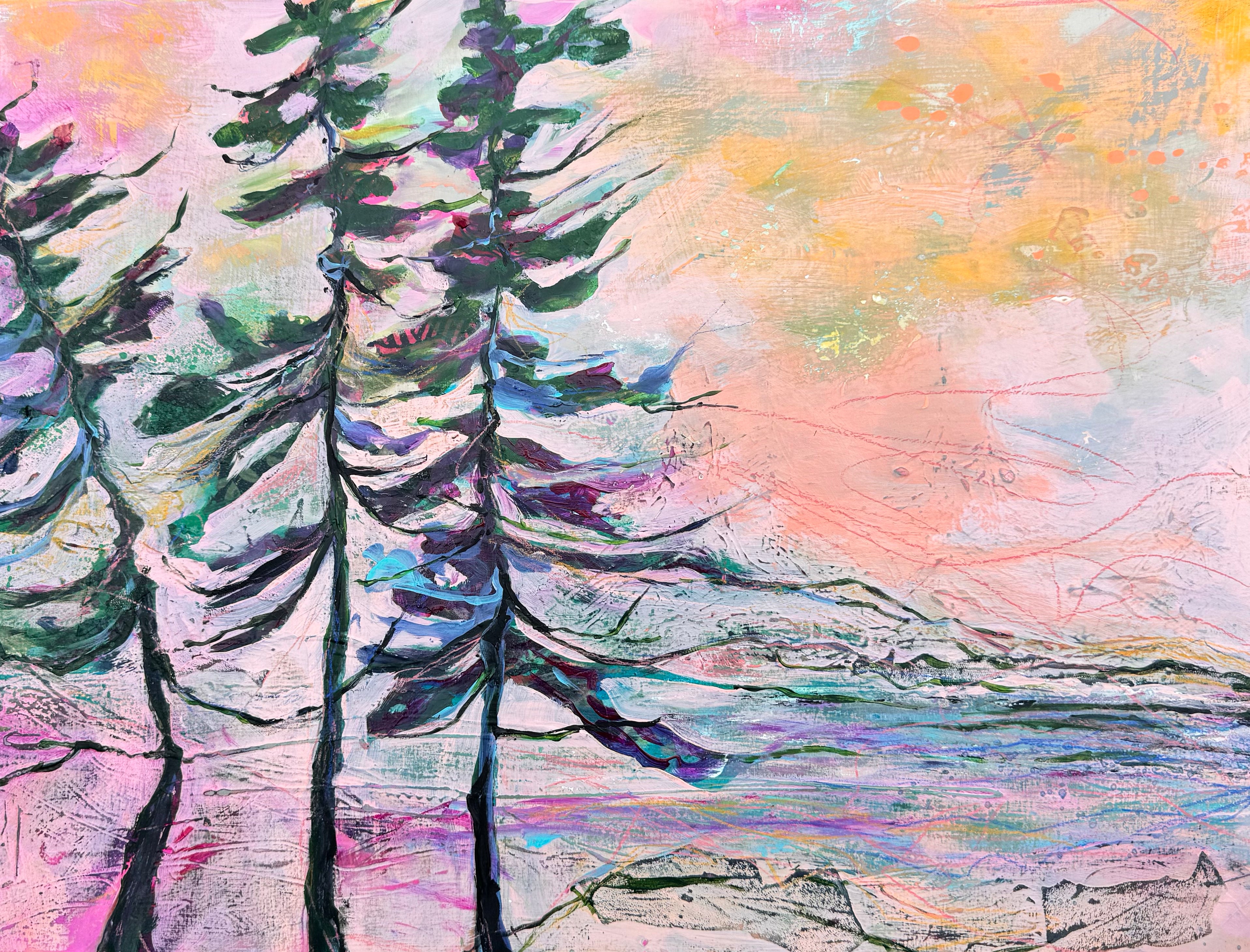 Medium: Acrylic, textile, and coloured pencil with museum grade epoxy finish