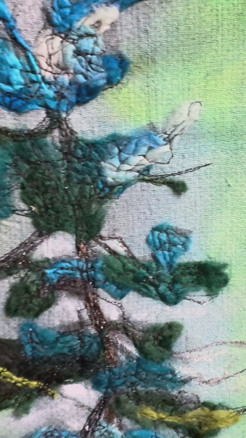 A single white pine stands alone, rising with quiet determination. Its form reaches upward through soft layers of colour and wool, anchored yet striving, holding both solitude and strength in its gentle ascent.