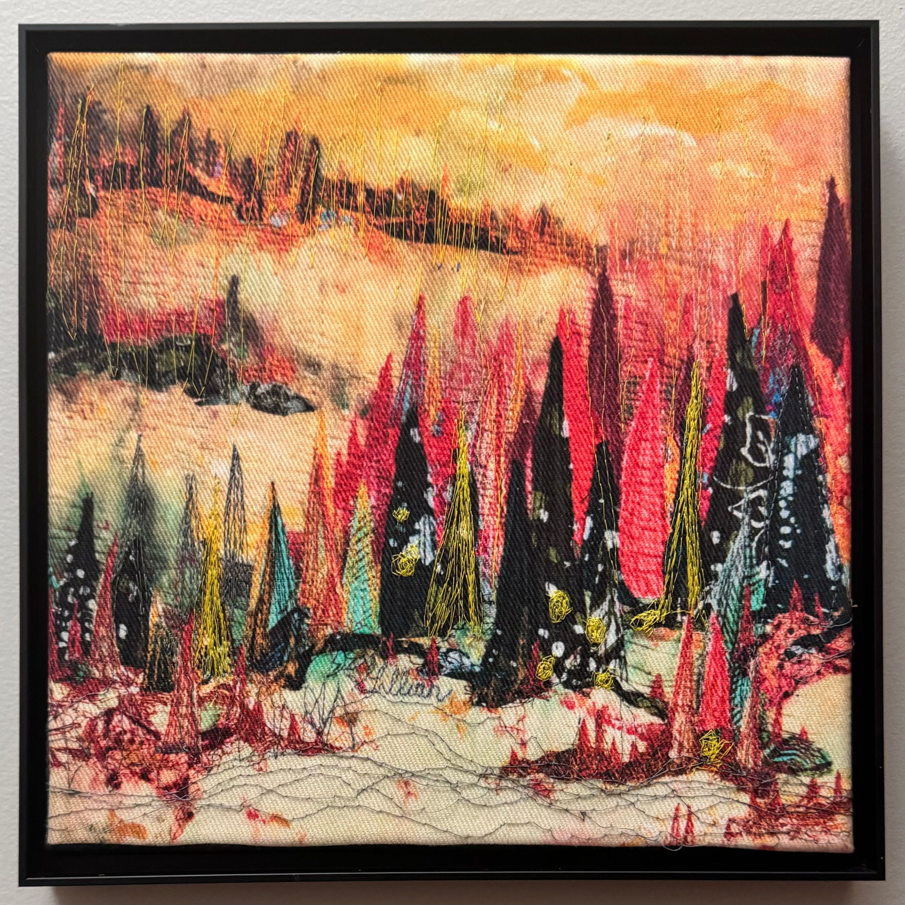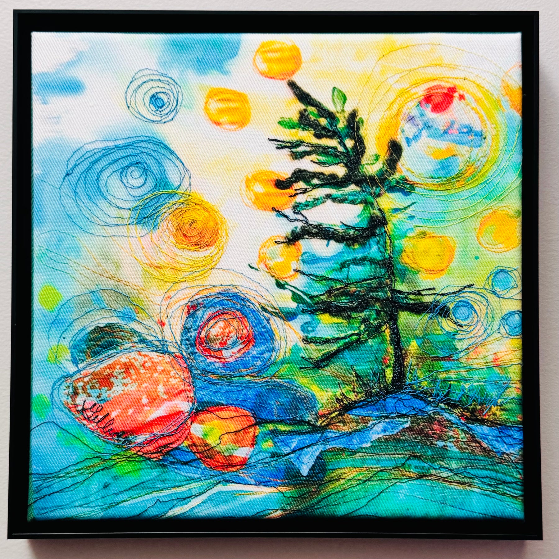 This one-of-a-kind textile piece measures 10" x 10" and is printed on premium canvas. Each piece is enhanced with intricate overstitching, offering a fresh and unique take on the original design. It comes in a sleek matte black metal floater frame, ready to hang, and is signed and numbered on the back with a certificate of authenticity.  The front has my stitched signature (but you may have to look very closely to find it).