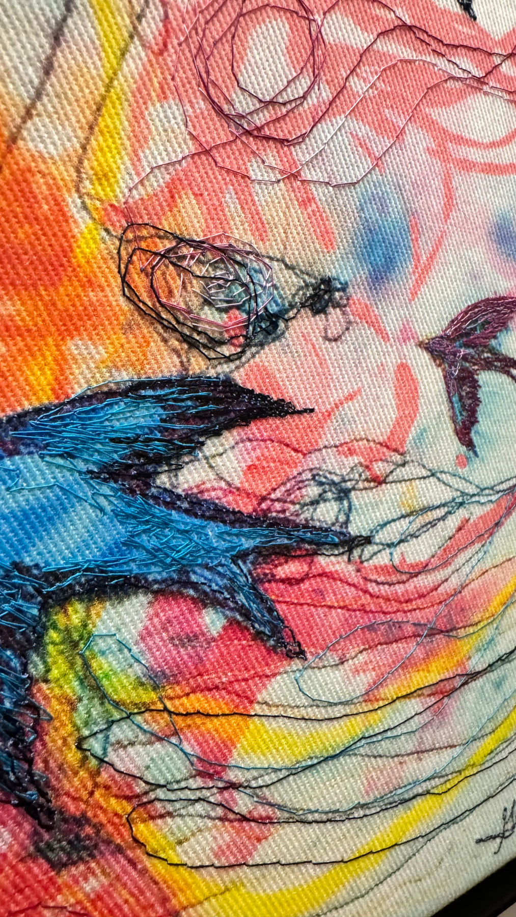 This one-of-a-kind textile piece measures 10" x 10" and is printed on premium canvas. Each piece is enhanced with intricate overstitching, offering a fresh and unique take on the original design. It comes in a sleek matte black metal floater frame, ready to hang, and is signed and numbered on the back with a certificate of authenticity.  The front has my stitched signature (but you may have to look very closely to find it).