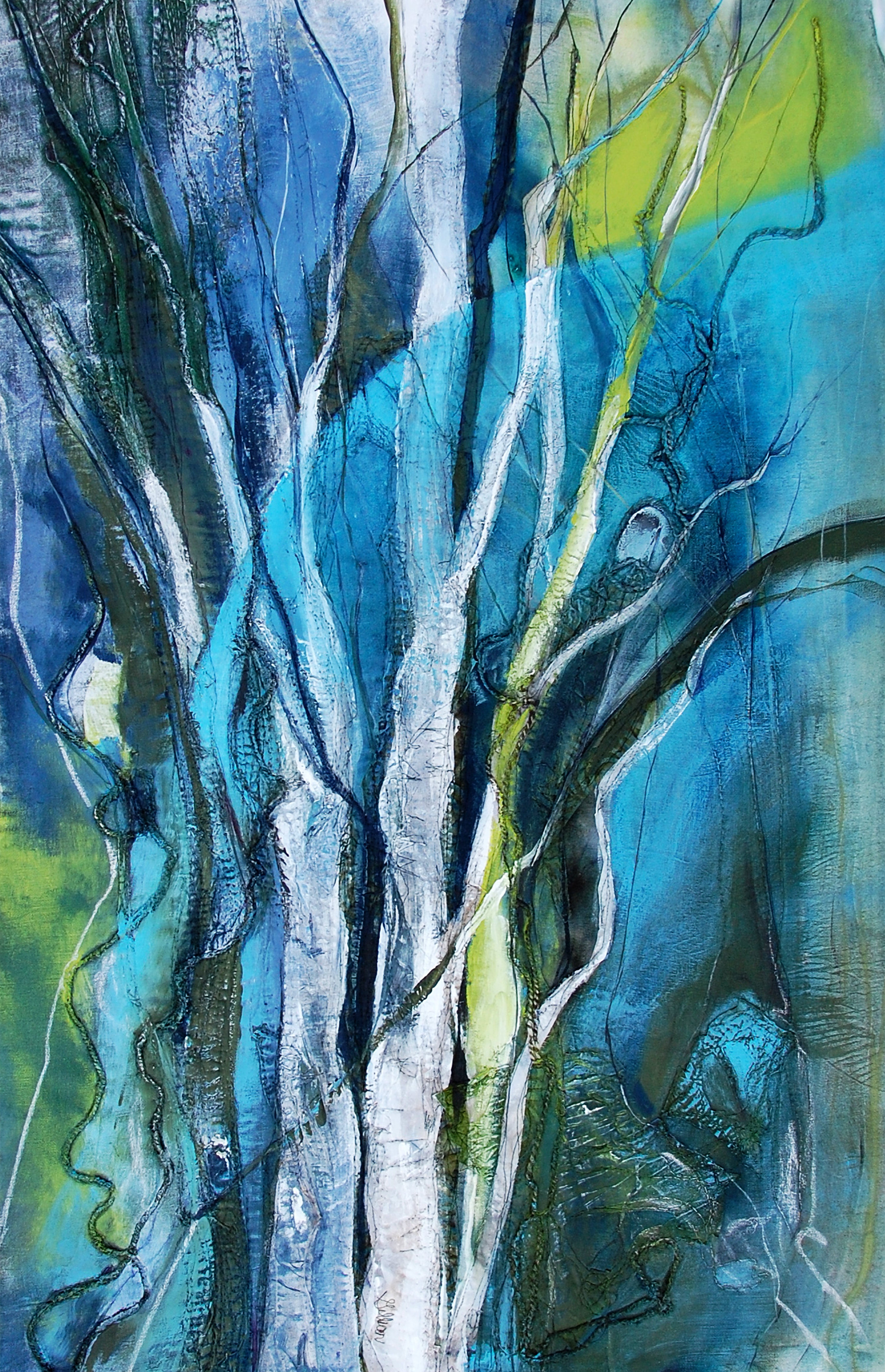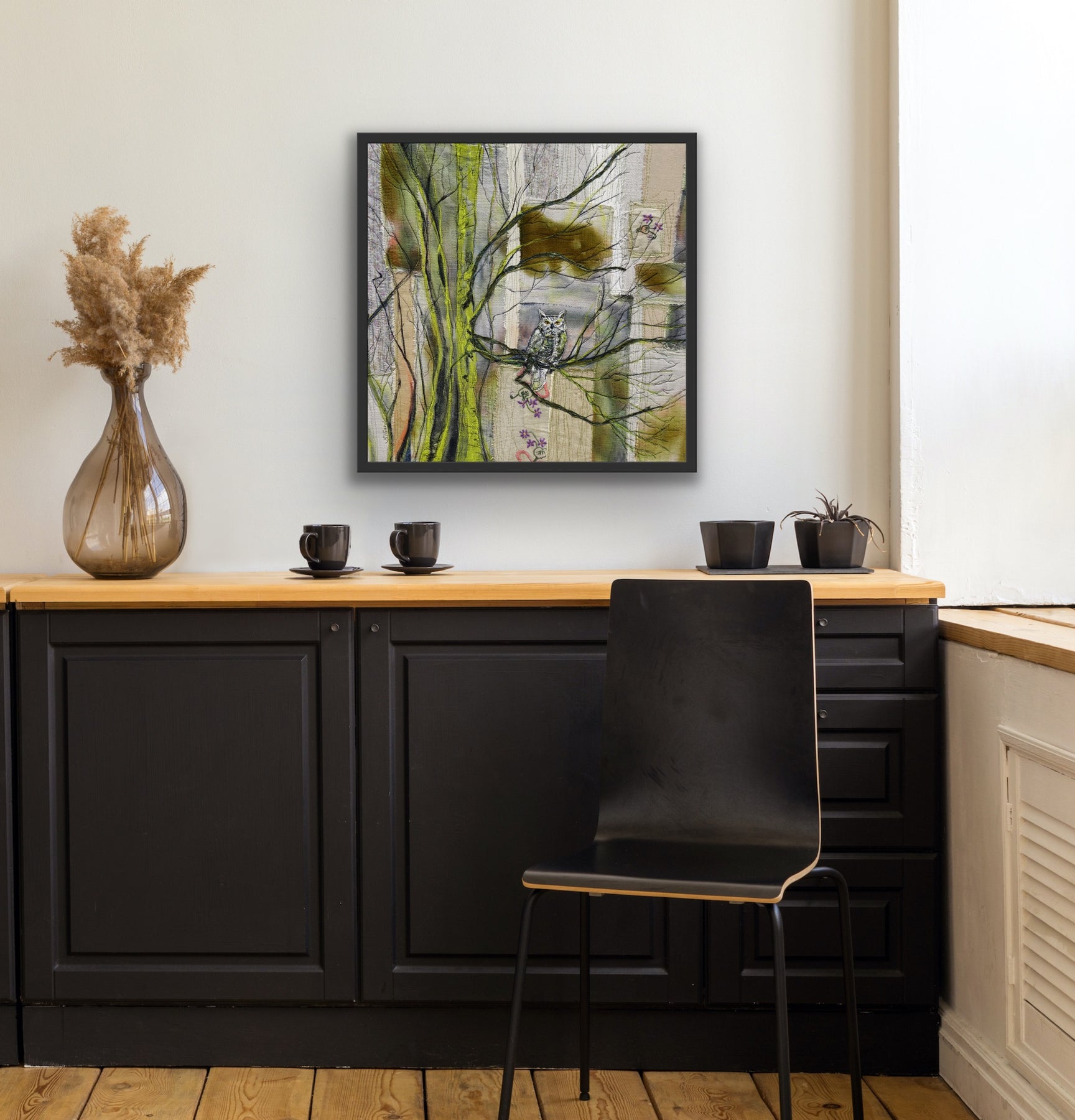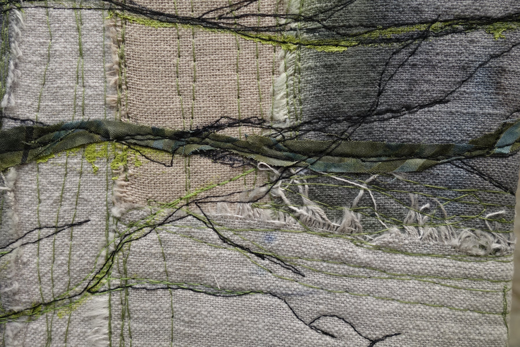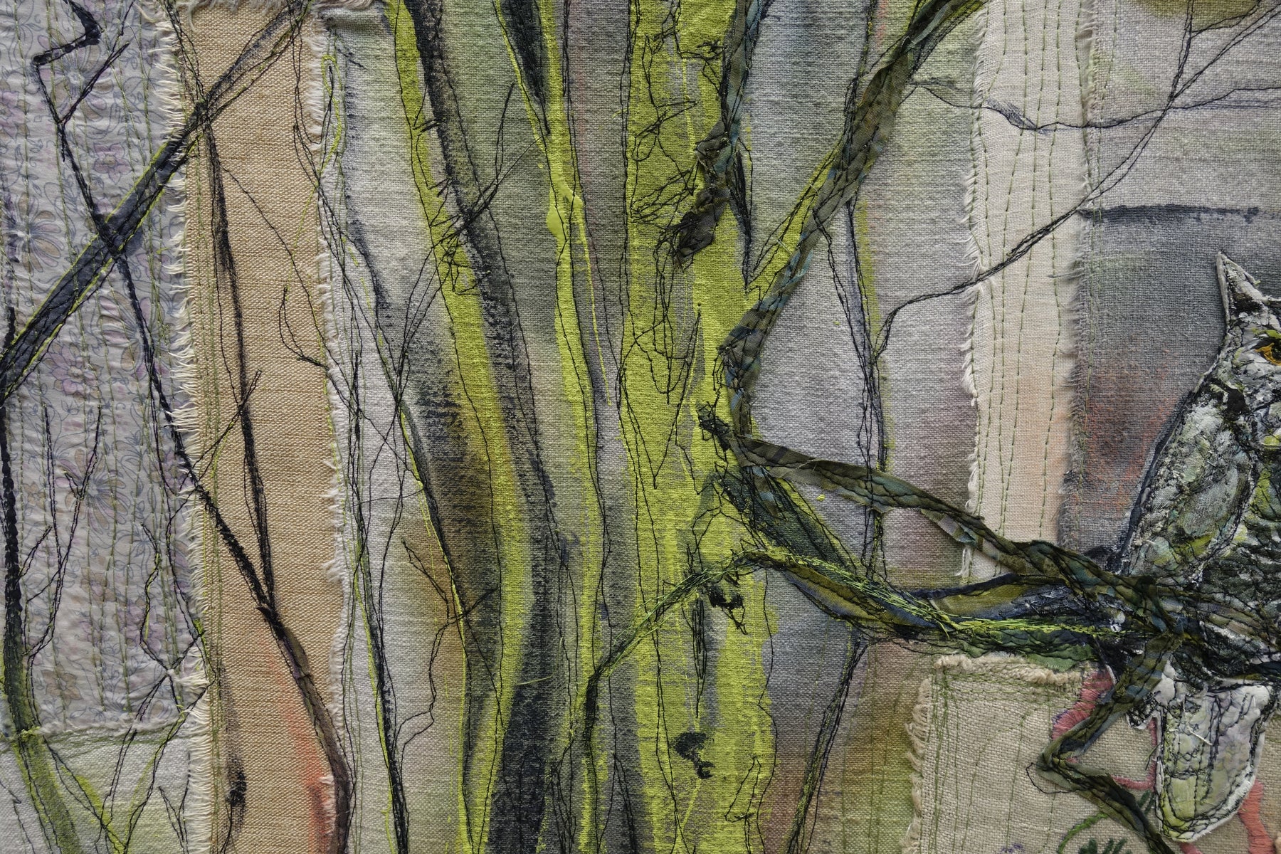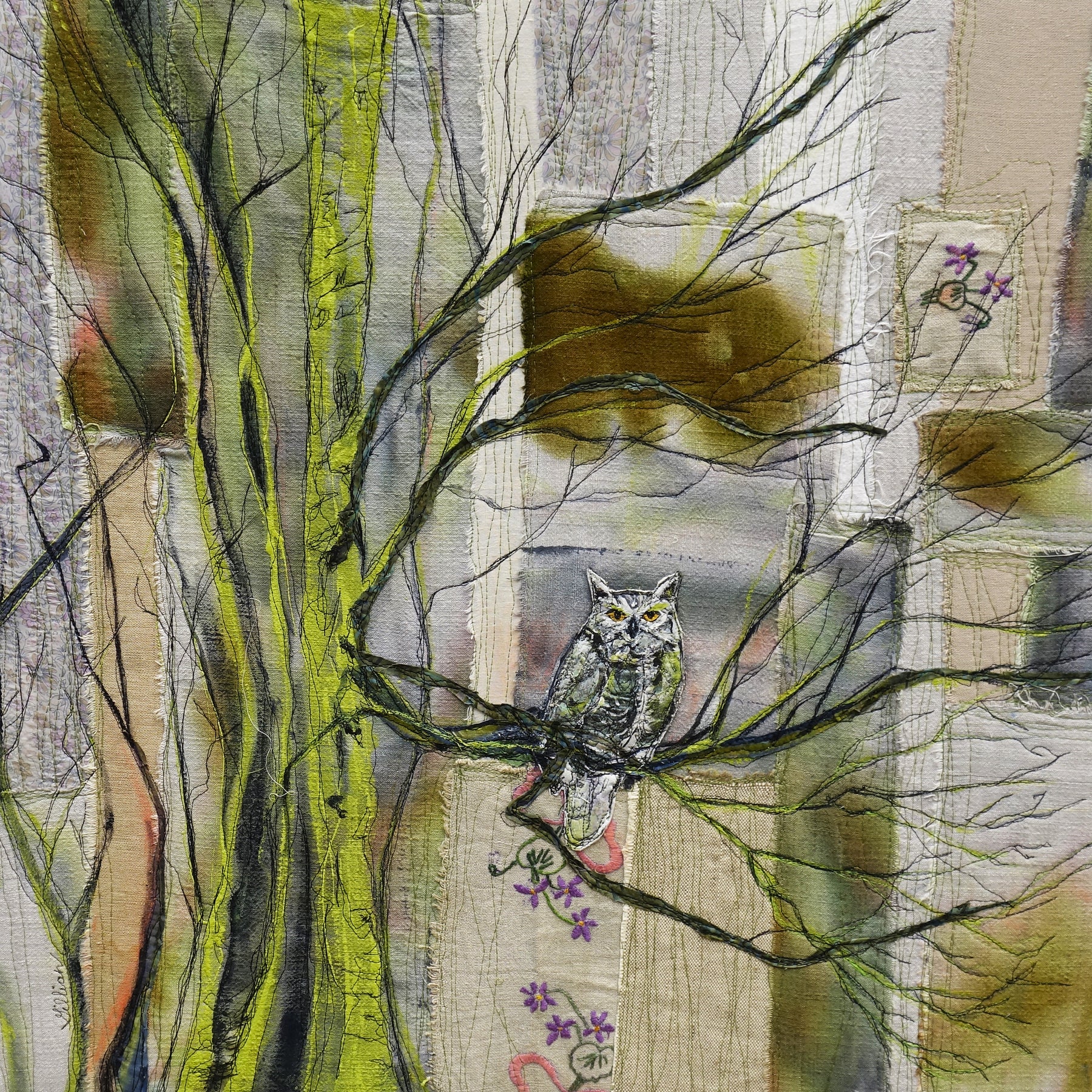 Textile art, machine and hand-stitched, with pieces of up-cycled linen tablecloths, hand-created owl appliqué