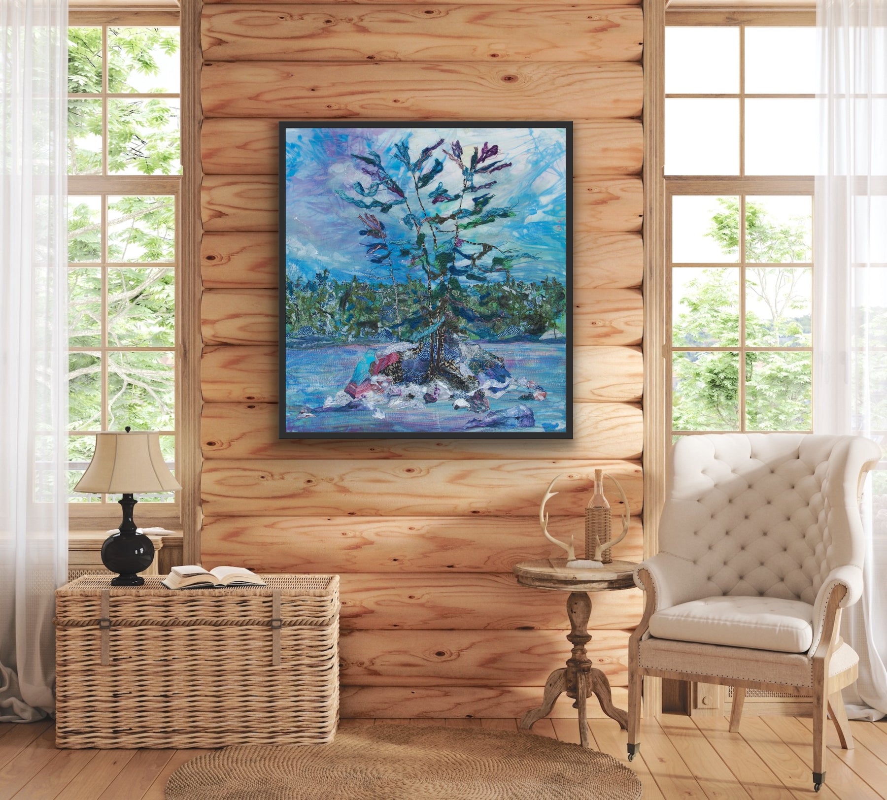 38" x 40" with a custom dark navy cedar frame
