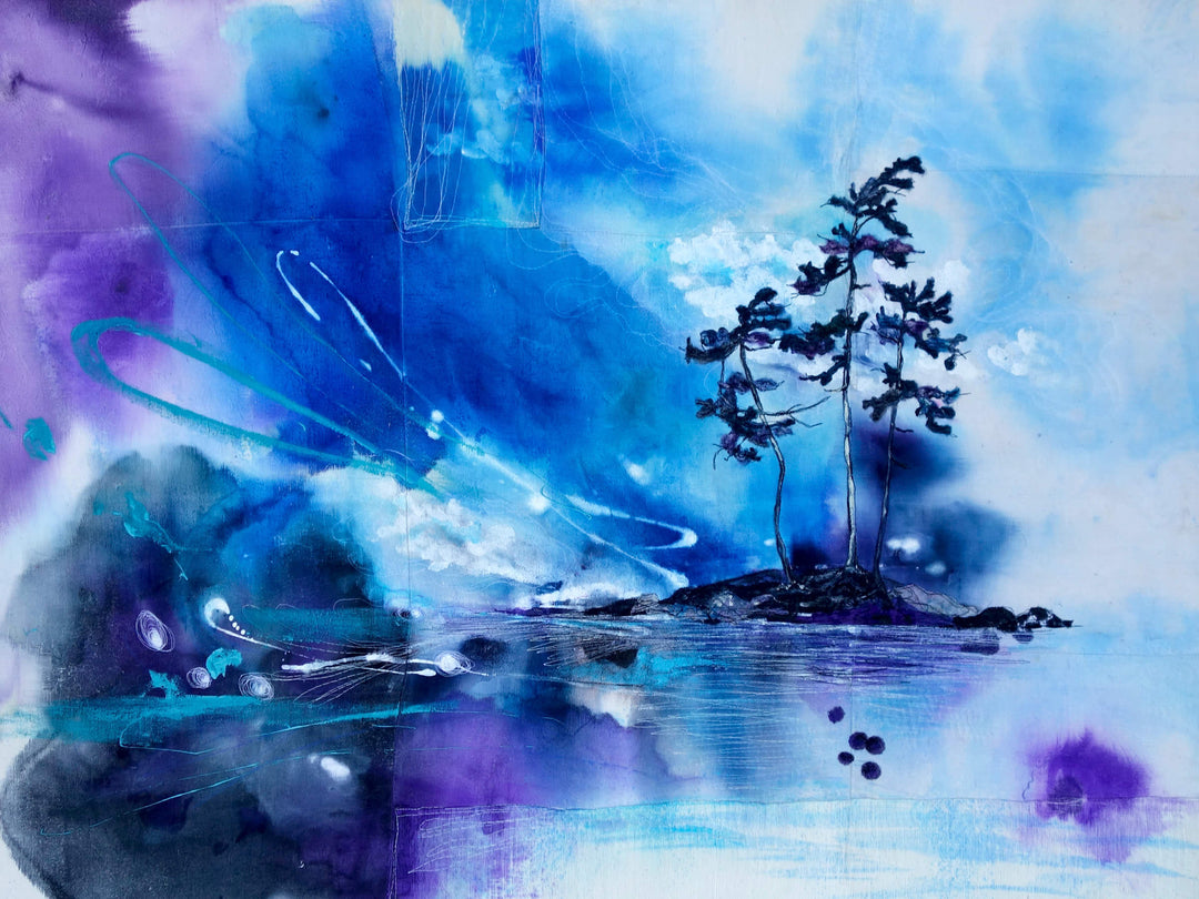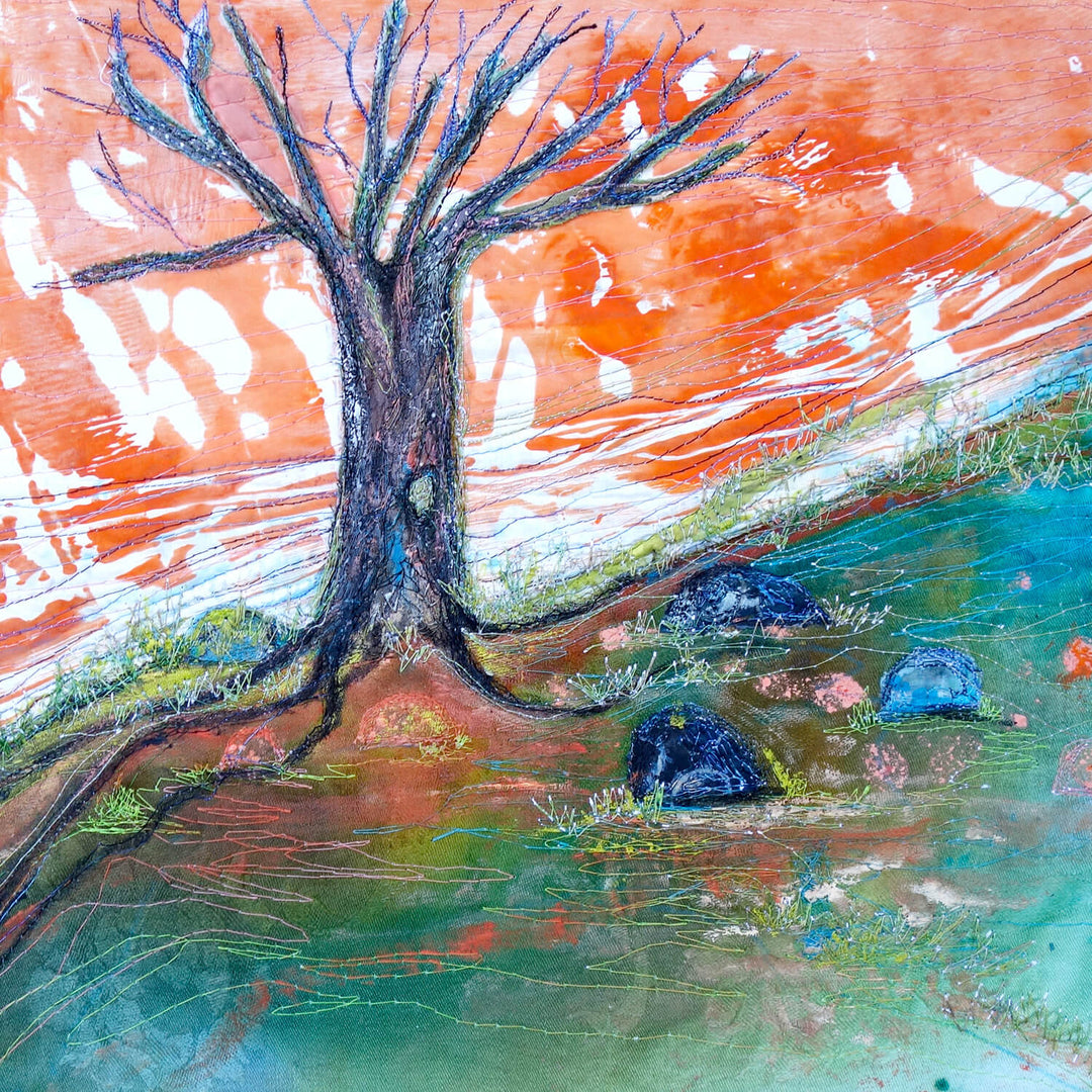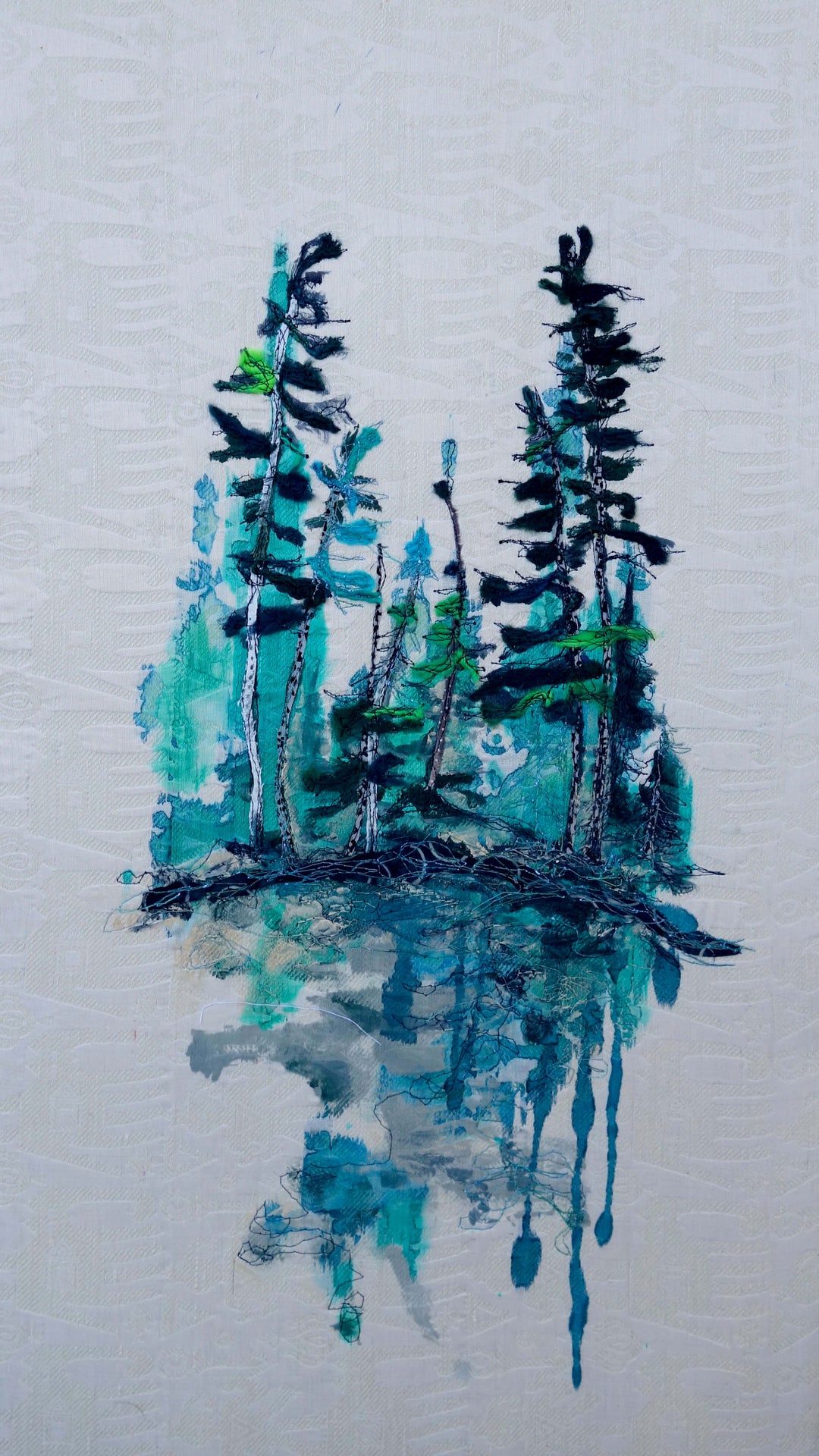 This new body of work gathers the many ways I moved through the landscape this year. Each piece follows its own thread, yet all share the same pull to slow down, look closely, and translate what the land offered into colour, stitch, texture, and light. Together, these works hold a year of noticing — the quiet moments, the shifting skies, the steady trees, the sudden wings.