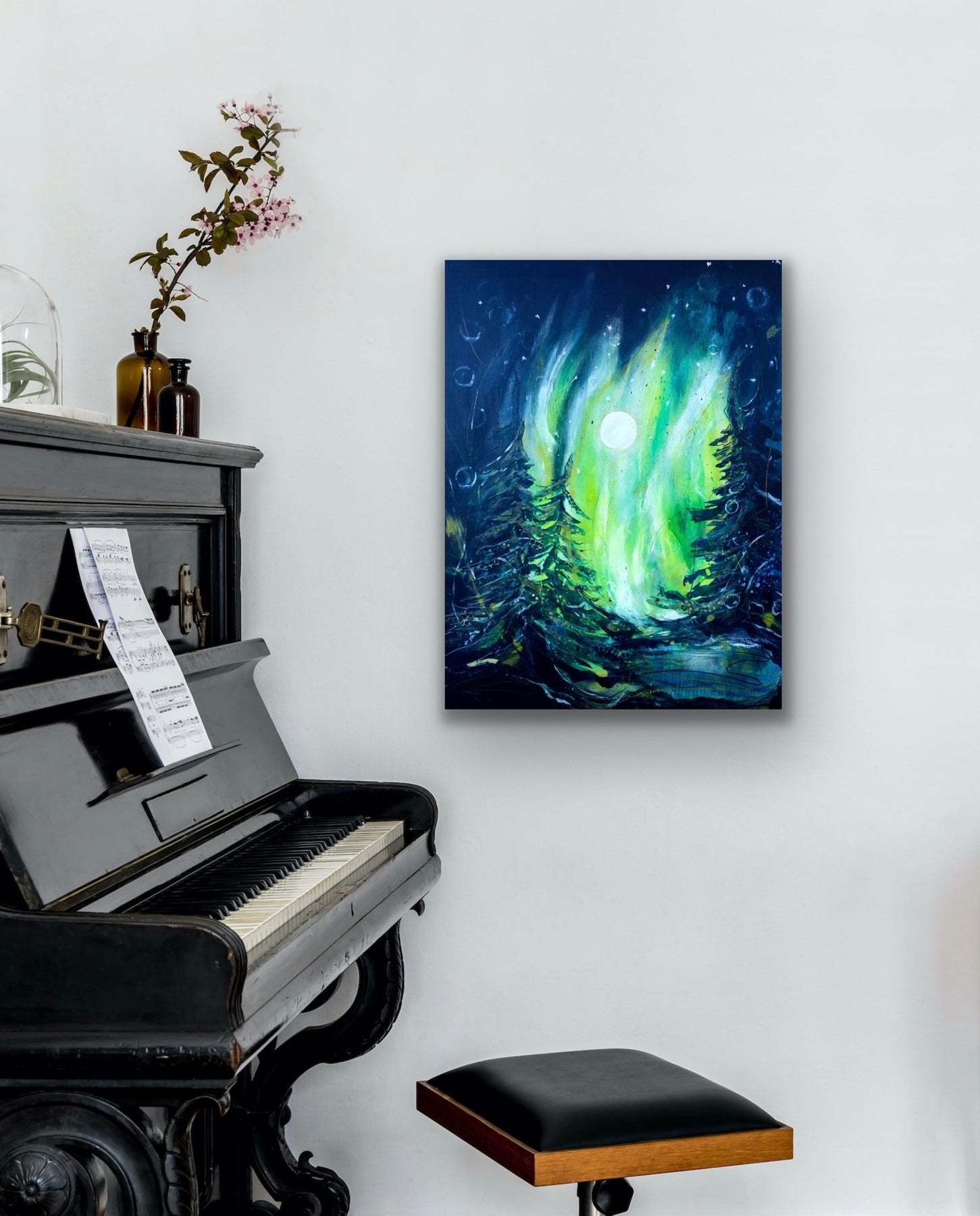 Beneath the quiet moon, the northern lights drift across a darkened sky, their soft motion breathing life into the night. In this meeting of shadow and shimmer, the air feels alive with quiet wonder, a reminder that even darkness can glow from within.