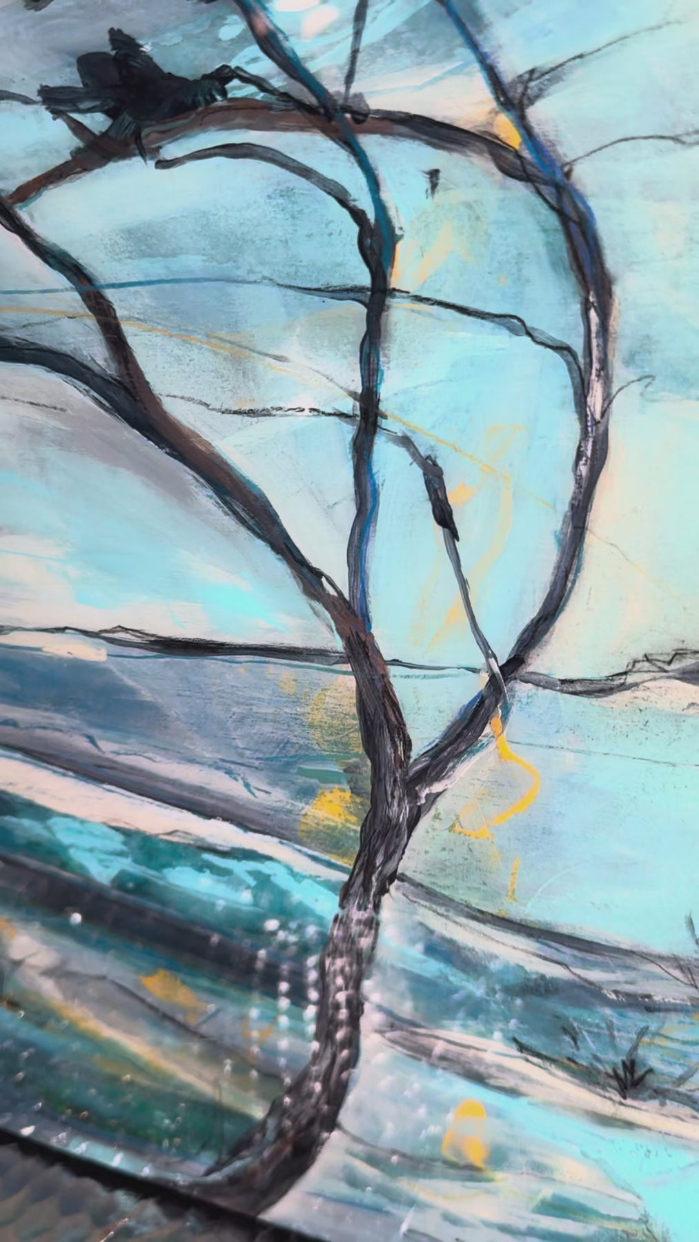 Texture and colour move in long, confident gestures as an implied tree anchors the composition. It feels both grounded and ascending, a contemporary study in strength without noise.